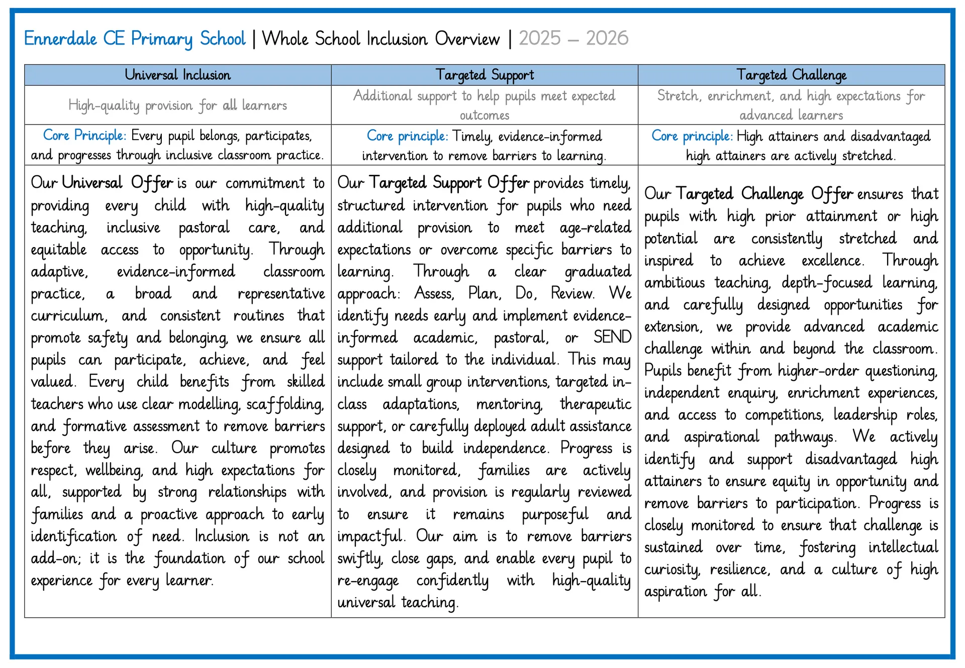 In keeping with our Christian ethos, we are committed to ensuring that every child is valued, supported and given the opportunity to achieve their very best. We recognise that children may need additional support at different times, and we work in partnership with parents, carers and professionals to meet each child’s individual needs.